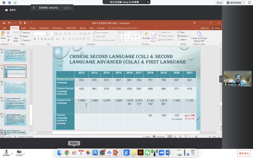 徐纪兴先生简要介绍了澳大利亚教育体系并对比了中澳高等教育机构的异同。他还进一步讲解了汉语教育在澳大利亚中小学和高等院校的发展情况及成效等。徐纪兴先生结合自身的工作经验及研究成果,详细阐述了澳大利亚汉语教育目前遇到的一些问题。在澳大利亚,虽然中文是继英文之后第二大语言,教学上取得一定成绩,但是受相关因素及疫情的影响,澳大利亚汉语教育缺乏专业人才,教材缺乏针对性和实用性,教学定位不够准确等问题明显。改进教学内容、方法、教材是当前国际汉语教育的重要议题。徐纪兴先生表示,未来希望能与华商学院紧密合作,共同探讨解决汉语国际教育事业所遇到的问题。