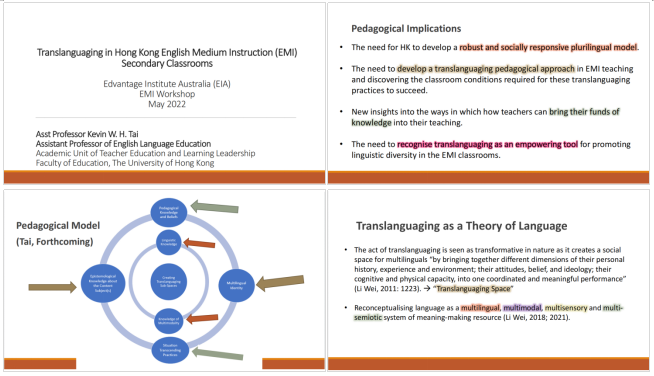 第一场培训讲座的主讲人是Kevin Tai博士, 主题是:语言转换、使用多语言的教学。Kevin Tai博士以英汉转译作为切入点阐述英语作为教学媒介EMI(English as a Media of Instruction)时应该掌握的一些方法、技巧和原则。他指出教师在英语作为媒介的教学中发挥着重要的作用,双语课程的教学需要教师将英语融入教学中,使得教学内容和所使用的教学语言融为一体,教师应该关注学生的语言基础,让学生意识到他们要在课程学习中获得本学科所需要的学术语言。他建议教师们要根据教学环境灵活调整双语教学方式,同时激发学生的英语学习动力,多鼓励学生参与课堂互动,促进英语知识的构建。