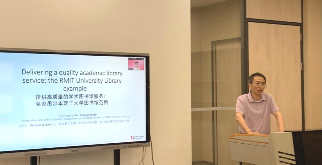 2023年4月20日,我校邀请EIA特聘教师Deb Wright为我校图书馆全体员工做题为“提供高质量的学术图书馆服务:以皇家墨尔本理工大学图书馆为例”的讲座,图书馆温万虎馆长、国际交流与合作处王文忠处长及图书馆全体员工出席。图书馆馆长温万虎主持讲座并介绍主讲人。