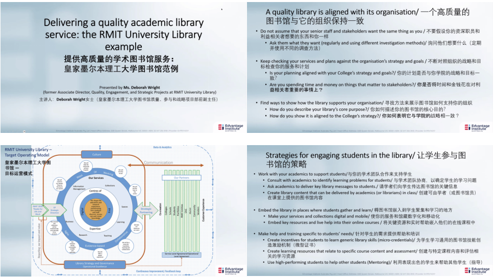Deb Wright以皇家墨尔本理工大学图书馆为例,分享了其目标运营模式,详细阐述了一个高质量学术图书馆服务的关键要素。她认为高质量的图书馆要与所在院校目标保持高度一致;图书馆需要重视以用户为中心的设计;建设一个高质量的图书馆要着眼于未来。Deb Wright通过案例分享了使学生与图书馆密切联系、联结的策略,进而提升学术图书馆的服务质量。她建议利用新科技,引进数据化战略,建立数字化平台,助力图书馆的资源与服务效力最大化,为学生与教师提供一站式服务。