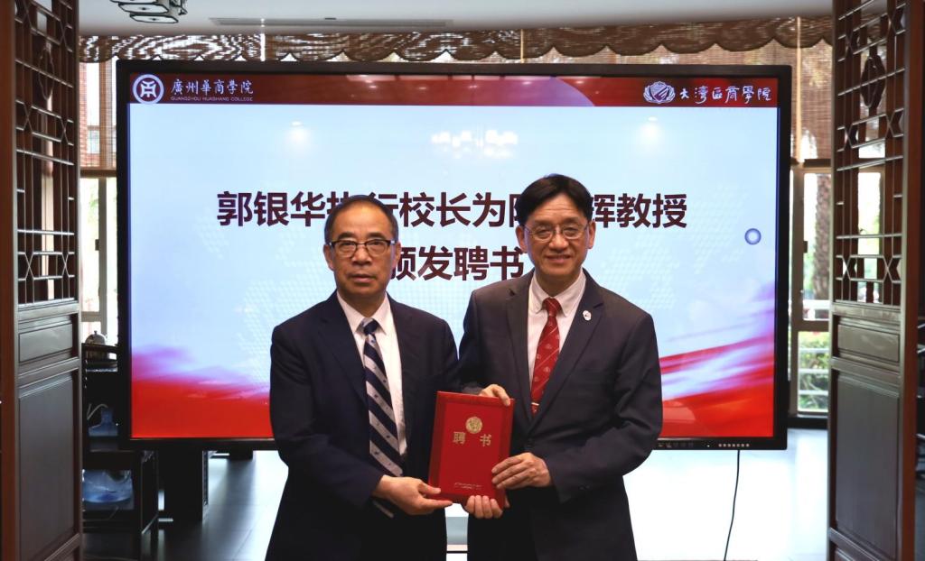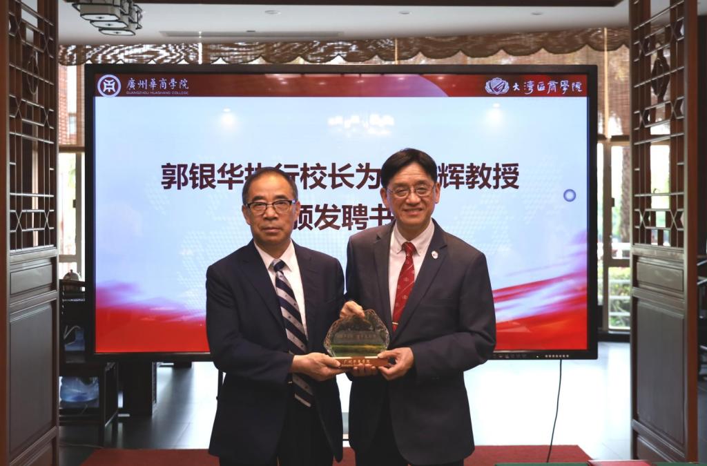 6月29日下午,大湾区商学院校长陈志辉教授受聘为广州华商学院客座教授仪式及两校合作备忘签署仪式在图书馆一楼美术馆举行。大湾区商学院协理副校长李倩容博士、协理副校长陈行健先生、校长办公室总监麦婉君女士、校长私人助理孙雅萍女士、广州华商学院执行校长郭银华、校长助理余家军、校长助理黄伟新、管理学院院长李招忠、管理学院副院长秦陇一、金融学院院长刘湘云、国际交流与合作处处长暨港澳台办公室主任王文忠等参加受聘仪式。