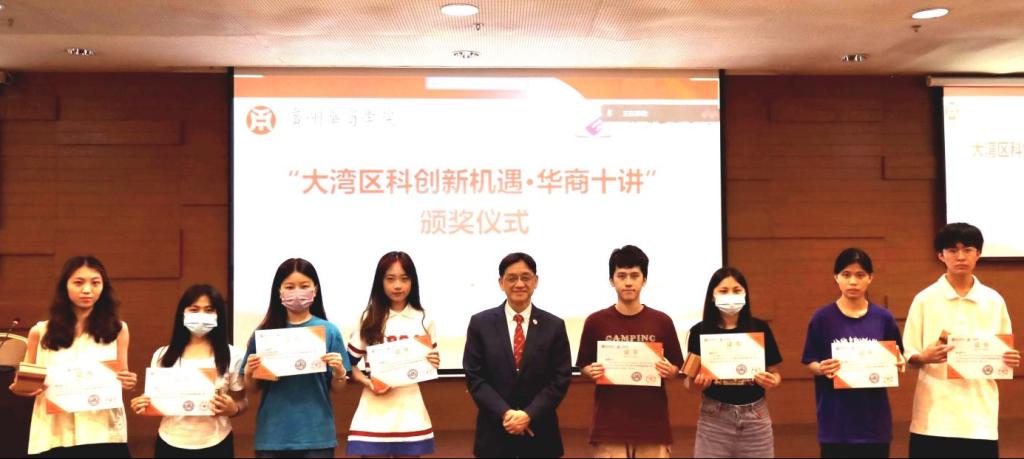 会谈结束后,陈志辉教授为我校师生做题为“如何赋能学生们在大湾区的长远发展︰相应的教学和建立超级网络平台?”的讲座。华商学院执行校长郭银华主持讲座。讲座开始前,陈志辉教授为全程参加“大湾区科创新机遇•华商十讲”的同学们颁发证书。