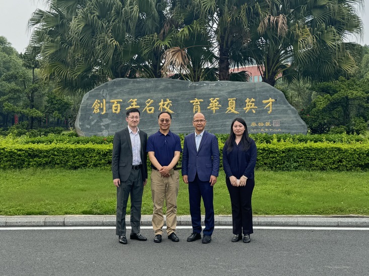 香港教育工作者联会主席黄锦良(右二)、广州华商学院副校长廖伊曼(左二)华商外语实验学校副校长付红根(右一)、副校长唐双同(左一)合影