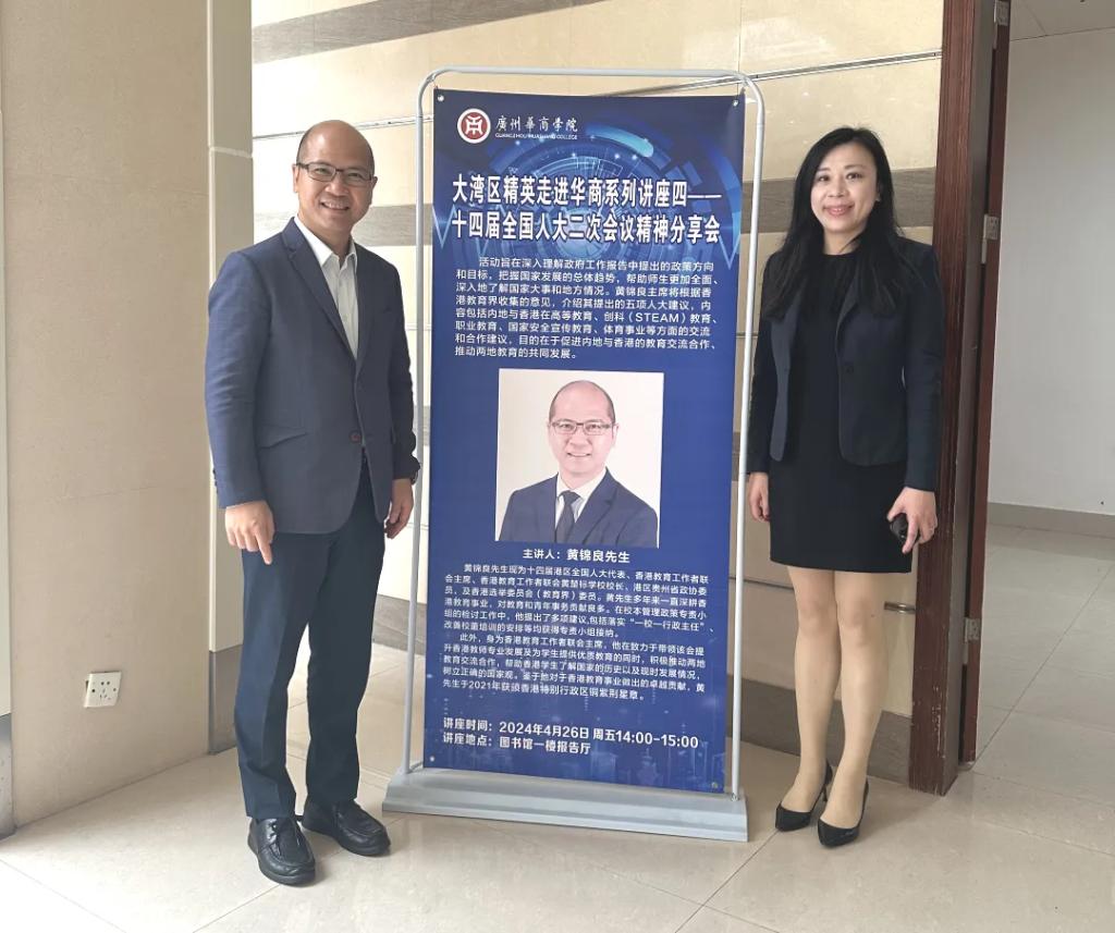 香港教育工作者联会主席黄锦良(左)、广州华商学院副校长廖伊曼(右)合影