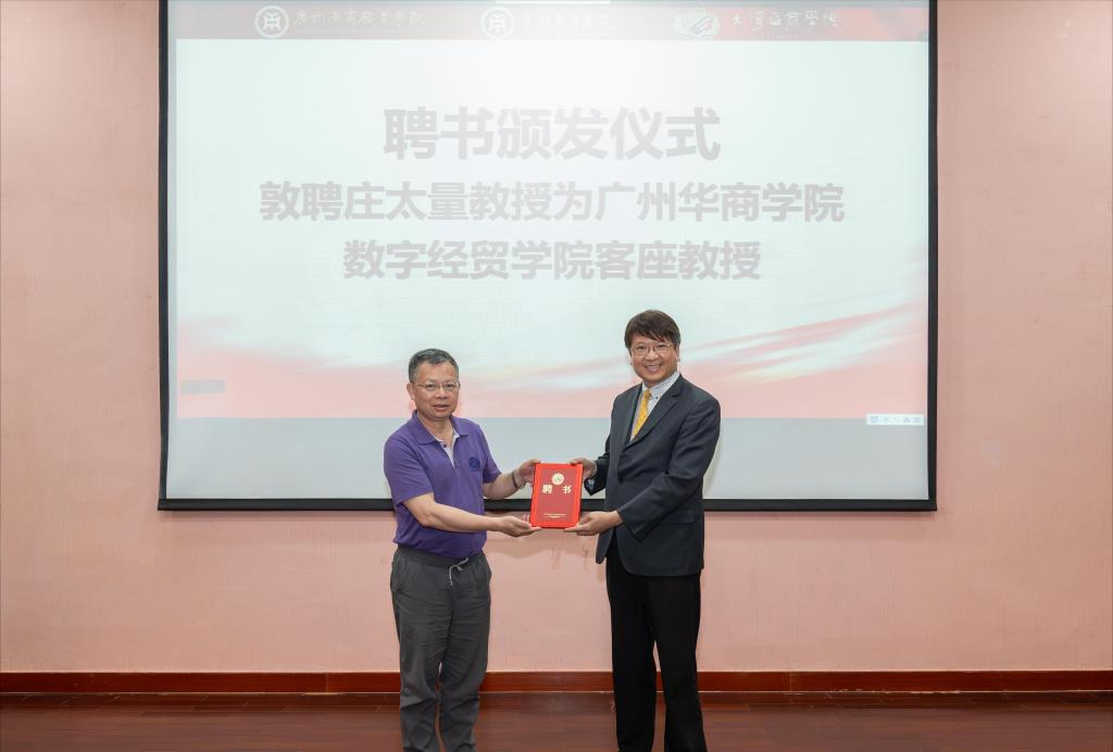 讲座开始前,我校举行了客座教授聘任仪式,数字经贸学院李广明院长为庄太量教授颁发聘书。