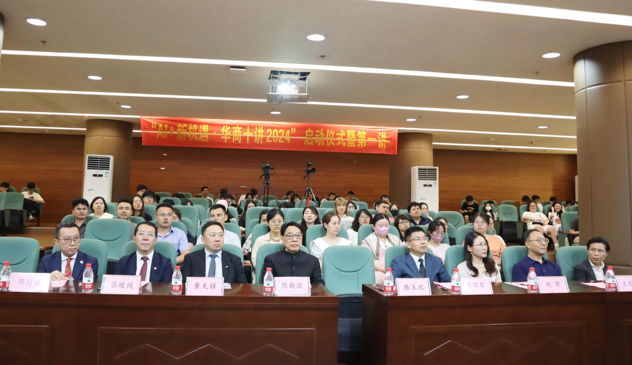 6月11日下午,华商教育集团旗下三所院校,广州华商学院、大湾区商学院、广州华商职业学院联合举办的大型系列公益讲座“AI+新机遇•华商十讲2024”启动仪式及第一讲活动在广州华商学院图书馆隆重举行。粤港澳三地近4千人线上线下参加此次活动。香港都会大学校董事会主席、有利集团副董事长黄天祥博士工程师、大湾区商学院协理副校长陈行健、大湾区商学院校长办公室总监麦婉君、中科院院士、广州华商学院校长陈新滋、广州华商学院党委书记陈玉欢、广州华商职业学院校长余家军等领导及师生代表参加现场活动。