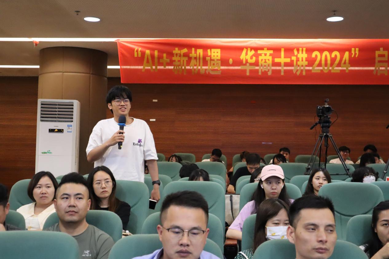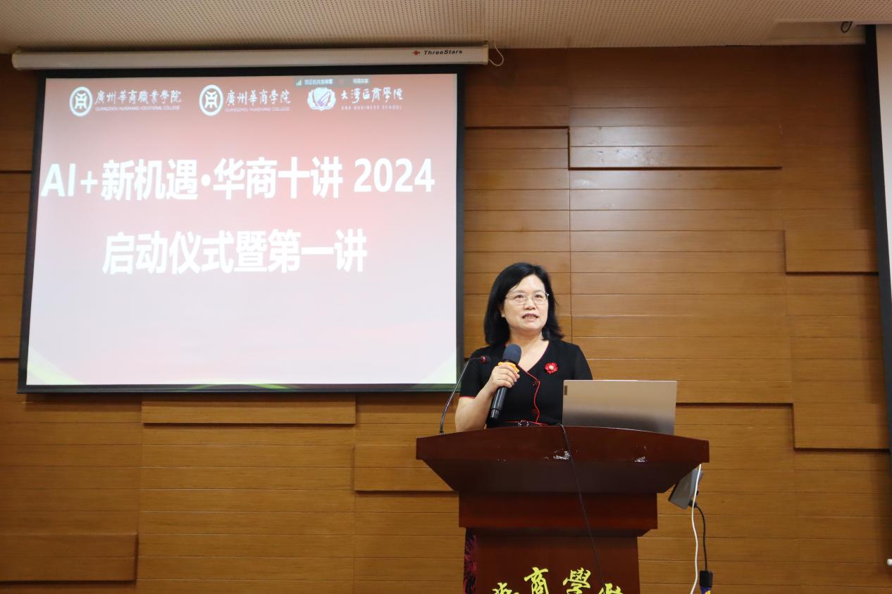 “十讲”启动仪式上,广州华商学院党委陈玉欢书记致辞。她指出,当今时代AI技术突飞猛进,给各行业带来了新的挑战和机遇;大湾区的建设、融合日新月异;“一带一路”合作更加深入广泛;AI + 大湾区 + “一带一路” + 各行业,会给我们的经济生活、社会发展,特别是教育工作带来深刻变化,我们要认真探讨和研究,让AI在湾区建设中发挥其突出作用。以不同的视角分析AI技术与各行业融合的前景,提高湾区师生“AI能力”,更好地面向“AI时代的职场”。